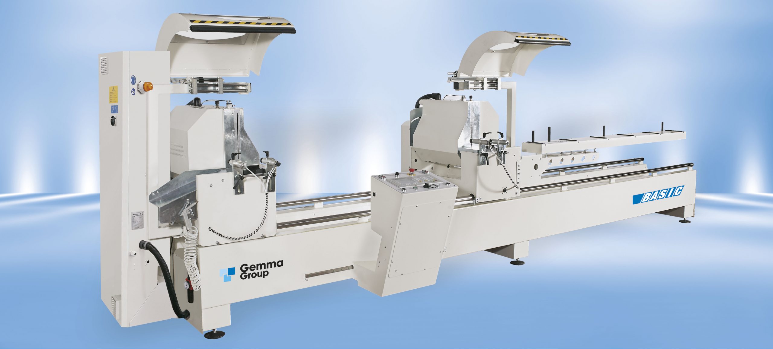 Two-head miter saw with front blades. Strongly ribbed base in electro-welded steel. Fixed left cutting unit, right unit with software-controlled automatic displacement.