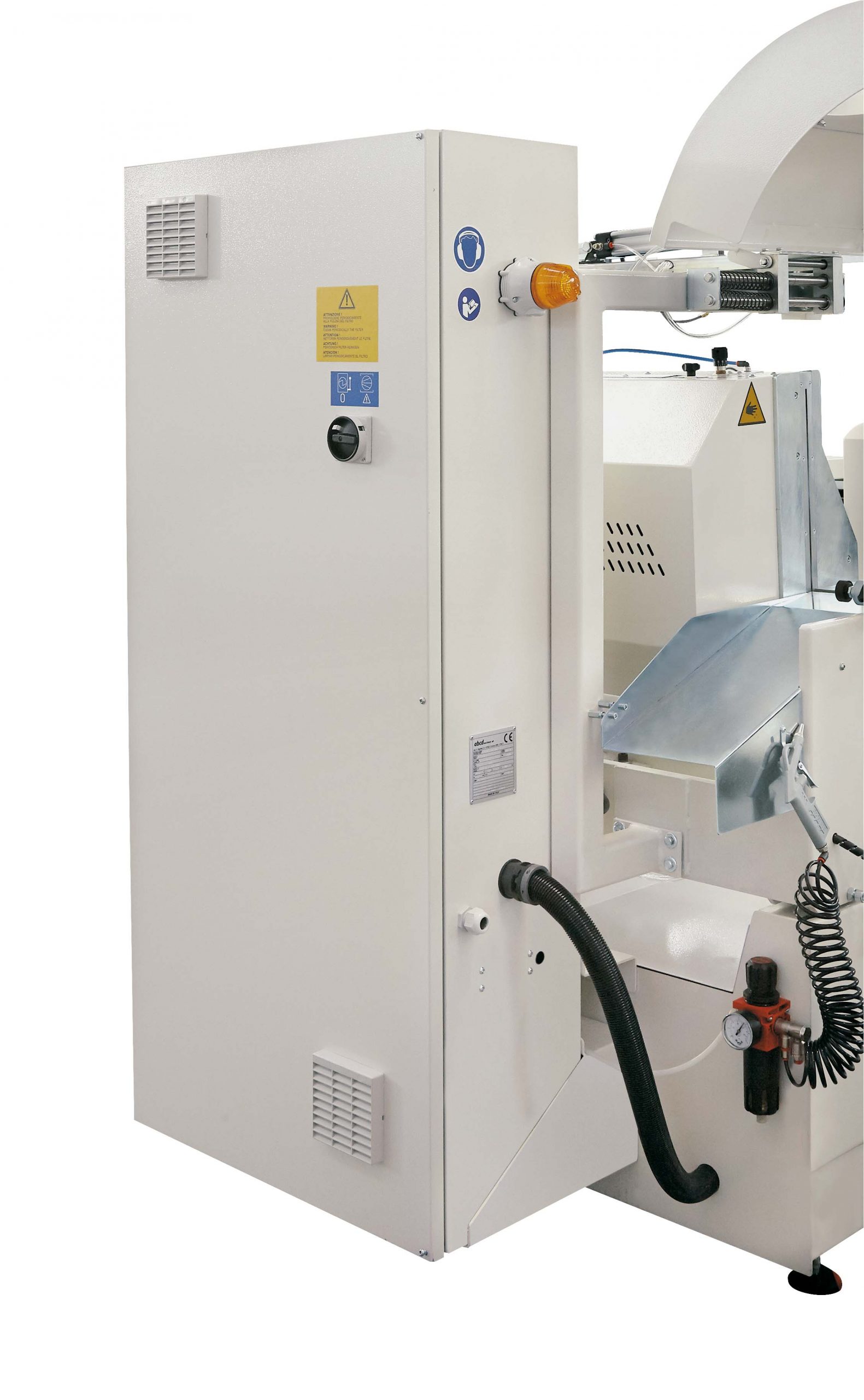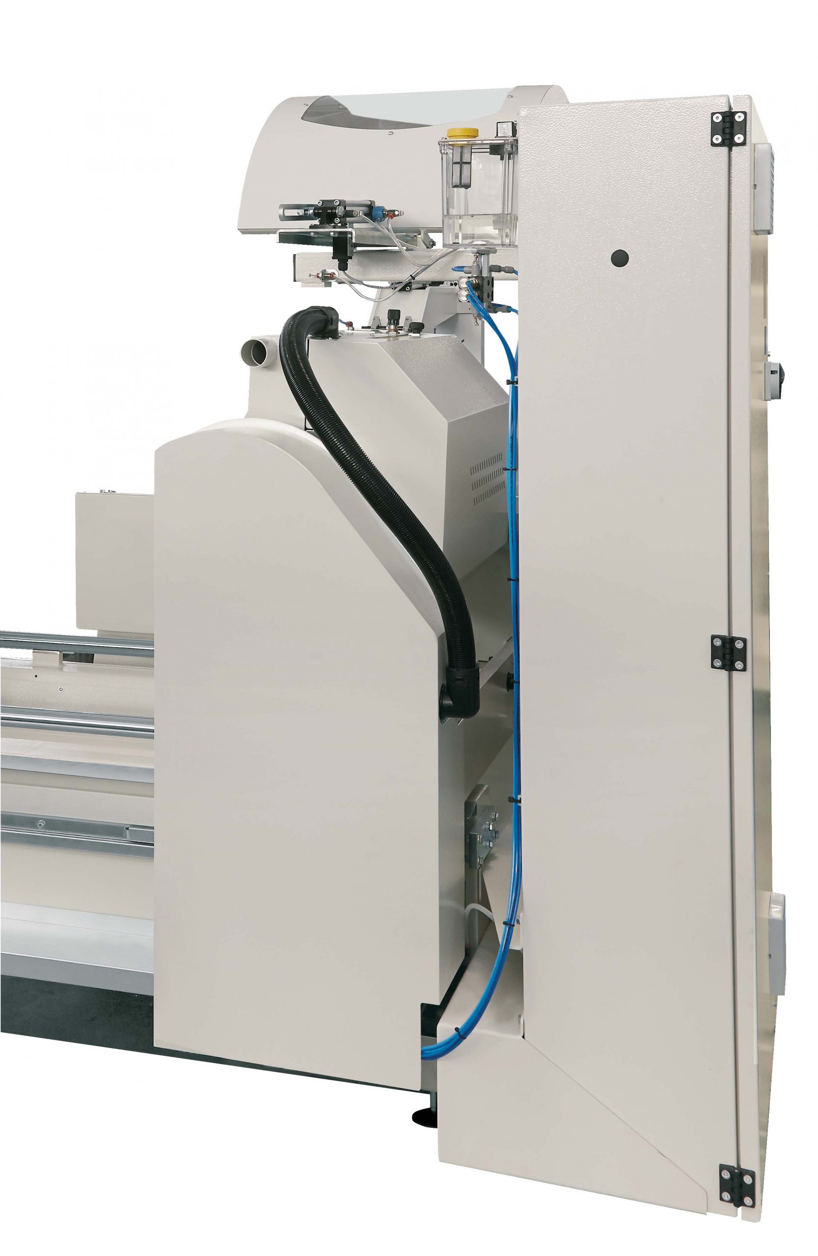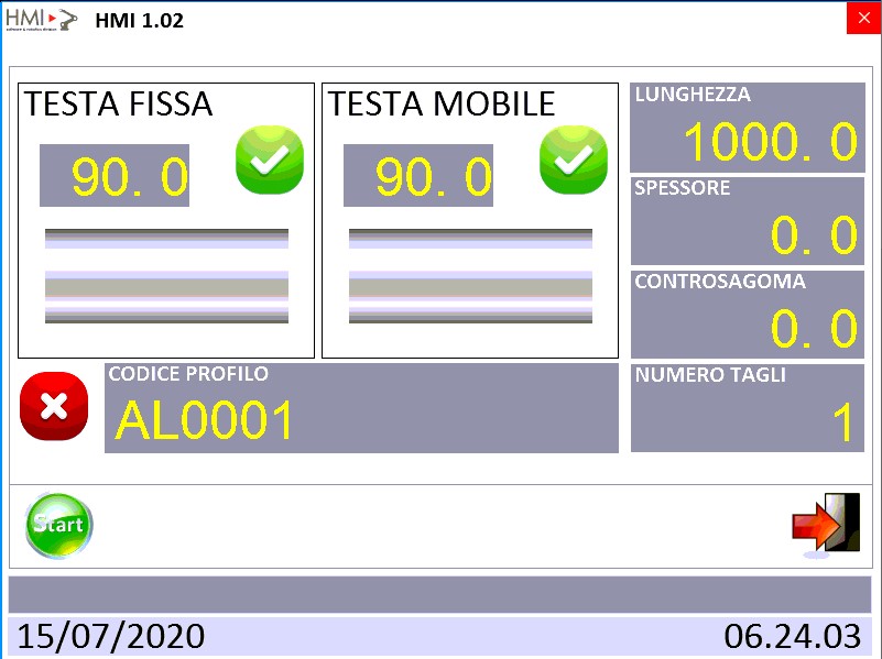 Two-head miter saw with front blades. Strongly ribbed base in electro-welded steel. Fixed left cutting unit, right unit with software-controlled automatic displacement. Infeed roller conveyor combined with the mobile head. Master A is equipped with 4 horizontal pneumatic clamps as standard. The cutting units are controlled by a 3 kW motor at 1,800 rpm and are equipped as standard with widia blades with a diameter of 600 mm. Micro-drop cutting lubrication. X-axis travel of 5,000 mm (optional 6,000 mm). X axis movement on linear guides with ground rack. Tilt angles from 20 ° to 135 ° with electronic adjustment. Possibility of machining on pieces even longer than the X stroke. Operator interface on PC-Windows equipped with 10.4 ”color touch-screen.